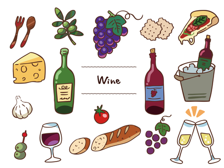 ワインとおつまみ ワイン,酒,手書き,葡萄酒,バー,カフェ,お酒,瓶,グラス,チーズのイラスト素材