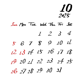 カレンダー2025.10月 祝日赤 2025,10月,10,カレンダー,ひと月,日曜始まり,シンプル,手描き,2025年,令和七年のイラスト素材