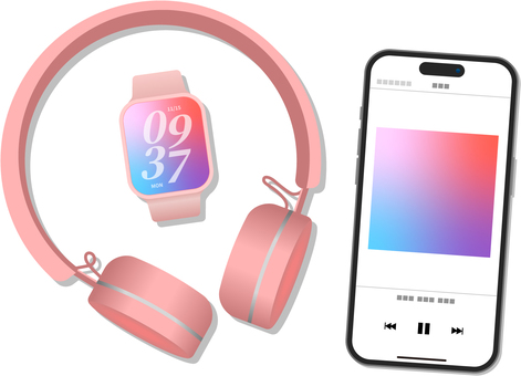女性向けデジタルガジェットのイラスト スマホ,スマートフォン,ヘッドホン,時計,女性,ピンク,おしゃれ,かわいい,腕時計,スマートウォッチのイラスト素材
