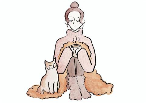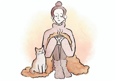 温活・リラックスする女性 猫 温活,女性,リラックス,温める,手描き,おしゃれ,水彩,インク,猫,寄り添うのイラスト素材