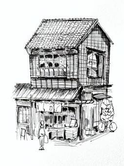 建築物7 構造物,人工物,建築,建物,日本家屋,商店,モノクロ,手描きのイラスト素材