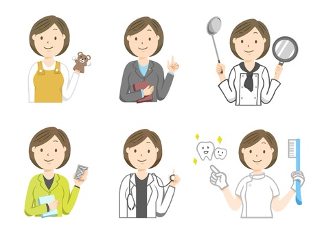 色々な職業(仕事)を集めたセット(女性) 保育士,幼稚園教諭,弁護士,コック,料理人,ファイナンシャルプランナー,医者,女医,歯医者,歯科医のイラスト素材