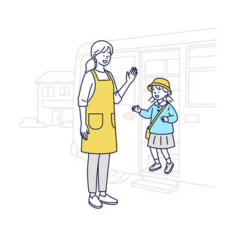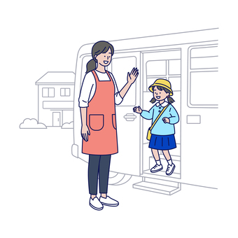 園バスに乗り込む園児と保育士 人物,登園,園児,幼稚園,保育園,保育士,先生,女の子,子ども,バスのイラスト素材