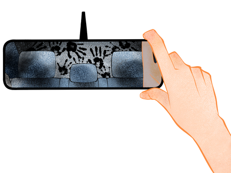 車のバックミラーにうつるホラーな手形 バックミラー,車,ホラー,後部座席,手形,たくさん,暗い,うつる,心霊,怪談のイラスト素材