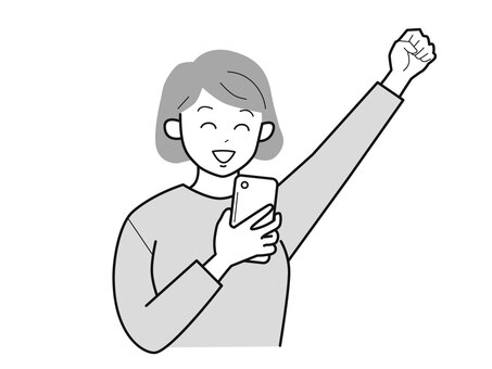 スマホと拳をあげるシニア女性2/白黒 上半身,長袖,スマホ,やる気,拳,おばあさん,50代,高齢者,シニア,女性のイラスト素材
