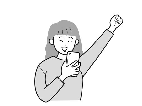 スマホと拳をあげる女子2/白黒