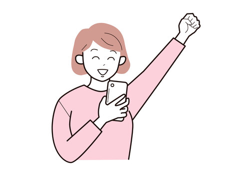 スマホと拳をあげる女性2/カラー 上半身,長袖,スマホ,やる気,拳,女性,お母さん,ママ,学生,社会人のイラスト素材