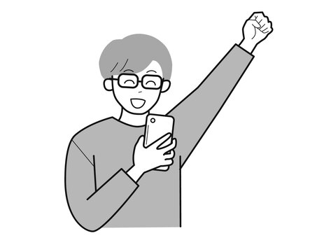 スマホと拳をあげる眼鏡男性2/白黒