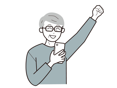 スマホと拳をあげるシニア男性2/カラー 上半身,長袖,スマホ,やる気,拳,おじいさん,50代,高齢者,シニア,眼鏡のイラスト素材