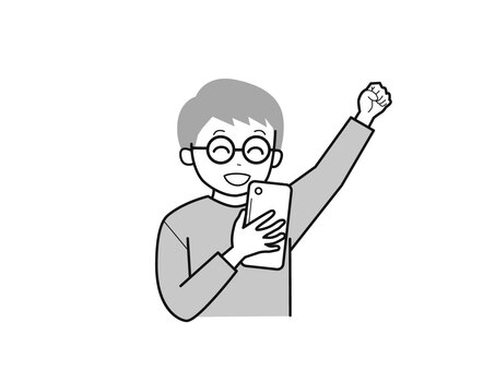 スマホと拳をあげるシニア男性2/白黒 上半身,長袖,スマホ,やる気,拳,おじいさん,50代,高齢者,シニア,眼鏡のイラスト素材