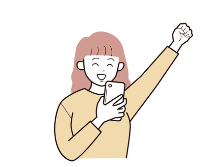 スマホと拳をあげる若い女性2/カラー