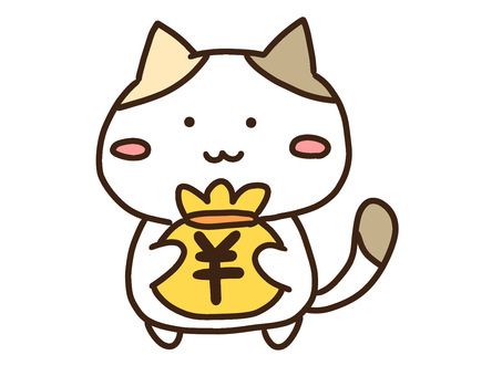 お金の袋を持つかわいいゆるい三毛猫 お金,金,袋,動物,ねこ,金融,経済,かわいい,手書き,イラストのイラスト素材