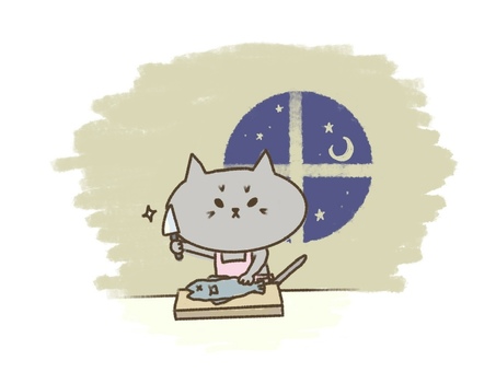魚を捌く猫 猫,捌く,料理,魚,包丁,まな板,夜,キッチン,エプロン,ロシアンブルーのイラスト素材