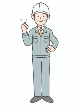腰に手とガッツポーズする建設作業員_全身