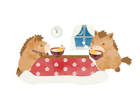 年越しそばを食べるかわいいお馬さんたち 大晦日,年越し,2026年,馬,動物,食べ物,年越しそば,干支,かわいい,お正月のイラスト素材