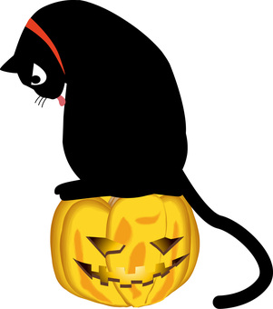 ハロウィン黒猫 ハロウィン,顔,かぼちゃ,乗る,黒猫,毛づくろい,座る,舌,かわいい,動物のイラスト素材