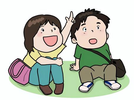 見上げる男女 イラスト 手描き,ハイキング,ピクニック,アウトドア,見上げる,見惚れる,笑顔,感動,楽しい,趣味のイラスト素材