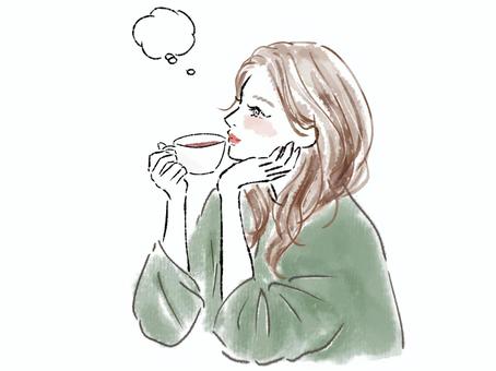 頬杖をついてコーヒー飲む女性の横顔 女性,コーヒー,吹き出し,ロングヘア,見上げる,考える,ファッション,ナチュラル,カップ,大人女子のイラスト素材