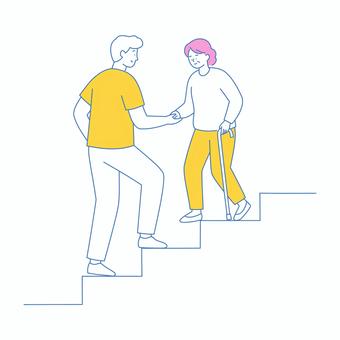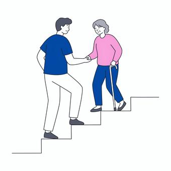 階段を介助する男性介護士と女性高齢者 人物,介護士,高齢者,階段,介助,支える,杖,男性,女性,移動のイラスト素材