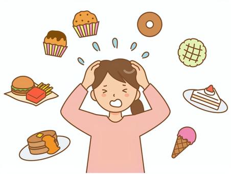 食欲が暴走して頭を抱える女性 食欲,ダイエット,我慢,ストレス,女性,カロリー制限,食事制限,糖質オフ,頭,抱えるのイラスト素材