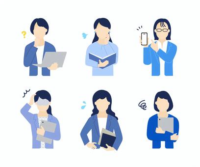 色々な表情のビジネスパーソンのイラスト 人物,女性,ビジネスウーマン,ビジネスパーソン,表情,ネガティブ,ポジティブ,困る,悩む,ため息のイラスト素材