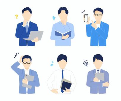 悩む男性ビジネスパーソンのイラストセット 人物,男性,ビジネスパーソン,ビジネスマン,コンサルタント,スーツ,疑問,悩む,困る,ため息のイラスト素材
