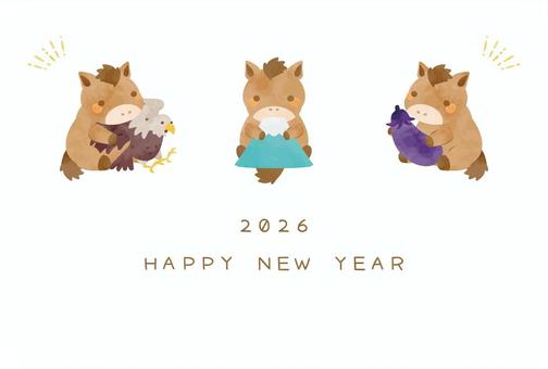 シンプルで可愛い午年の年賀状テンプレート ウマ,動物,年賀状,テンプレート,2026年,可愛い,初夢,水彩風,縁起物,富士山のイラスト素材