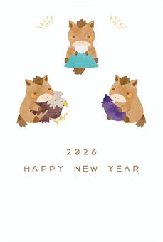 2026年茶色馬とお正月アイテムの年賀状 馬,午年,2026年,お正月,門松,招き猫,小判,コマ回し,一富士二鷹三茄子,富士山のイラスト素材