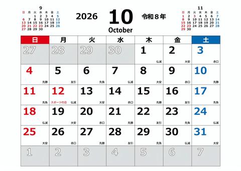 2026 令和8年 10月カレンダー 横 カレンダー,2026年,2026,令和8年,10月,10,october,六曜,祝日,a4のイラスト素材
