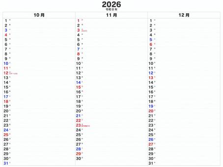 3か月カレンダー 2026 10~12月 カレンダー,2026,令和8年,10月,11月,12月,シンプル,3ヶ月のイラスト素材