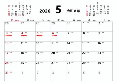 2026 令和8年 5月カレンダー 横 カレンダー,2026年,2026,令和8年,5月,5,may,六曜,祝日,a4のイラスト素材