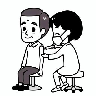 予防接種 シニア男性 白黒 予防接種,白黒,注射,筋肉注射,医療,医者,男性,高齢者,女医,マスクのイラスト素材
