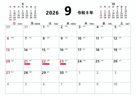 2026 令和8年 9月カレンダー 横 カレンダー,2026年,2026,令和8年,9月,9,september,六曜,祝日,a4のイラスト素材