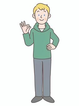 腰に手を当ててOKサインと白人男性_全身