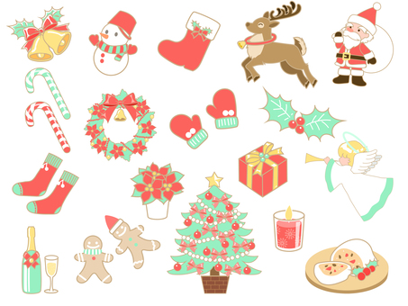 かわいいクリスマス素材シンプル線あり クリスマス,ベクター,セット,靴下,ミトン,シャンパン,ジンジャークッキー,飾り,アイコン,ポスカードのイラスト素材