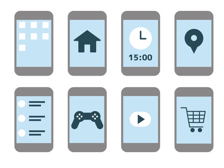 シンプルなスマホアイコンセット スマートフォン,スマホ,タブレット,アプリ,モニター,シンプル,デザイン,sns,カレンダー,通販のイラスト素材