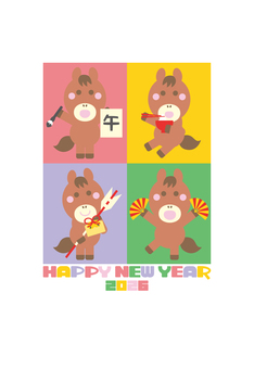白馬のかわいい年賀状(書初雑煮破魔矢扇)