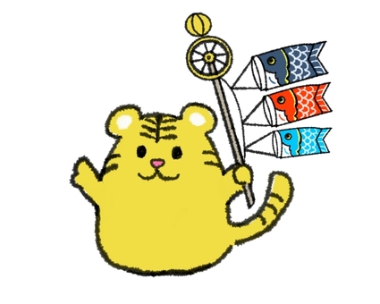 折り紙の兜をして鯉のぼりを持って歩くとら