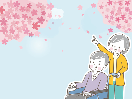 車椅子のシニア夫婦と笑顔の医療従事者達