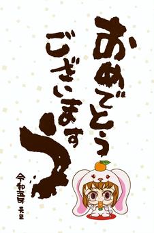 うさぎ着ぐるみ女の子と文字付き年賀状