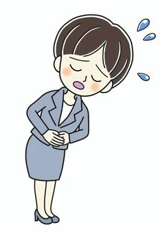 お辞儀して謝る、グレーのスーツの若い女性