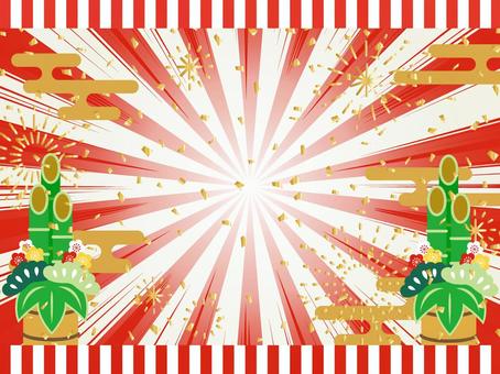 正月飾りと日の出、花火背景