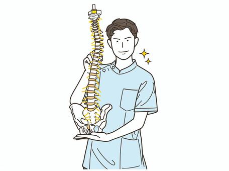 骨格模型を持つ白衣姿の笑顔の男性