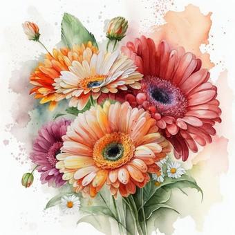 アナログ水彩ガーベラの花赤ピンクオレンジ