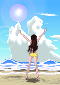 入道雲 空 海 波 砂浜 水着 女性