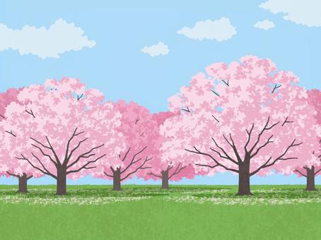 穏やかな青空に白い雲と緑の草原の水彩背景