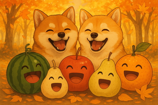 秋の果実に囲まれて微笑む豆柴 − 紅葉