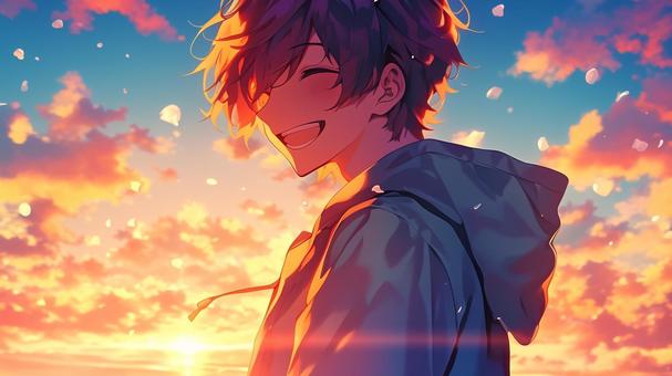 夕日の中の風に揺れる少年