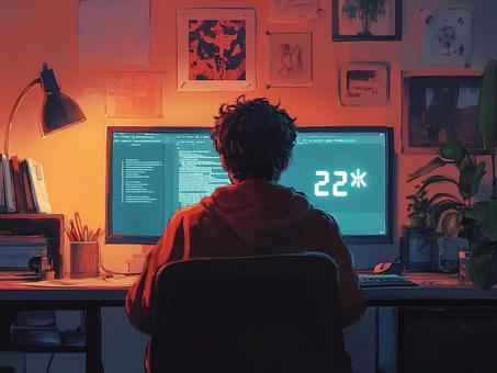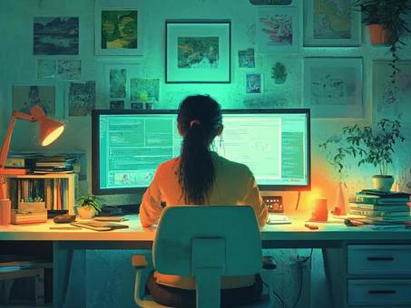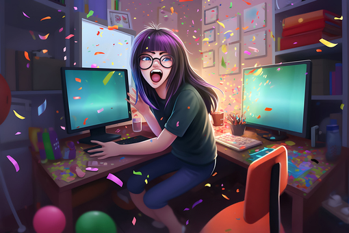 PC前で立ち上がって喜ぶ女の子と紙吹雪