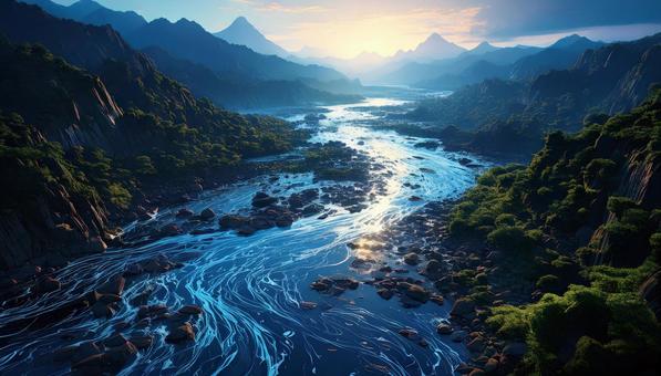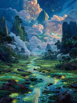 白い蝶が舞う山麓の草原と碧い清流_背景画